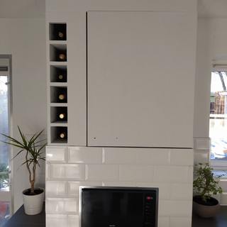 The carcuss for the cupboard was made from MDF panels , the door was MDF , your standard kitchen hinges cut out and fitted , and then the wine rack idea was introduced this changed the whole dynamics from being a cupboard hiding a boiler too a cool kitchen addition. Once the structure was erected it was time to plan how the bottom panels where going to be fitted but removable for boiler maintenance. We used a microwave as a great way to fill in the dead space that The cupbaord would have been floating over. Making the panels totally removable yet look like part of the kitchen wall using the same style of tiles to carry on around and blend in was a lovely addition it really made you forget there's a boiler behind this design. Incorporating a wine rack, microwave housing all around the boiler saves space in the kitchen.